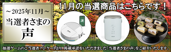 数年前から抽選ゲームで、初めて当選しました。やったー!とても嬉しいです。ありがとうございます。届くのを楽しみにしております。これからもチャレンジ続けますのでよろしくお願いいたします。