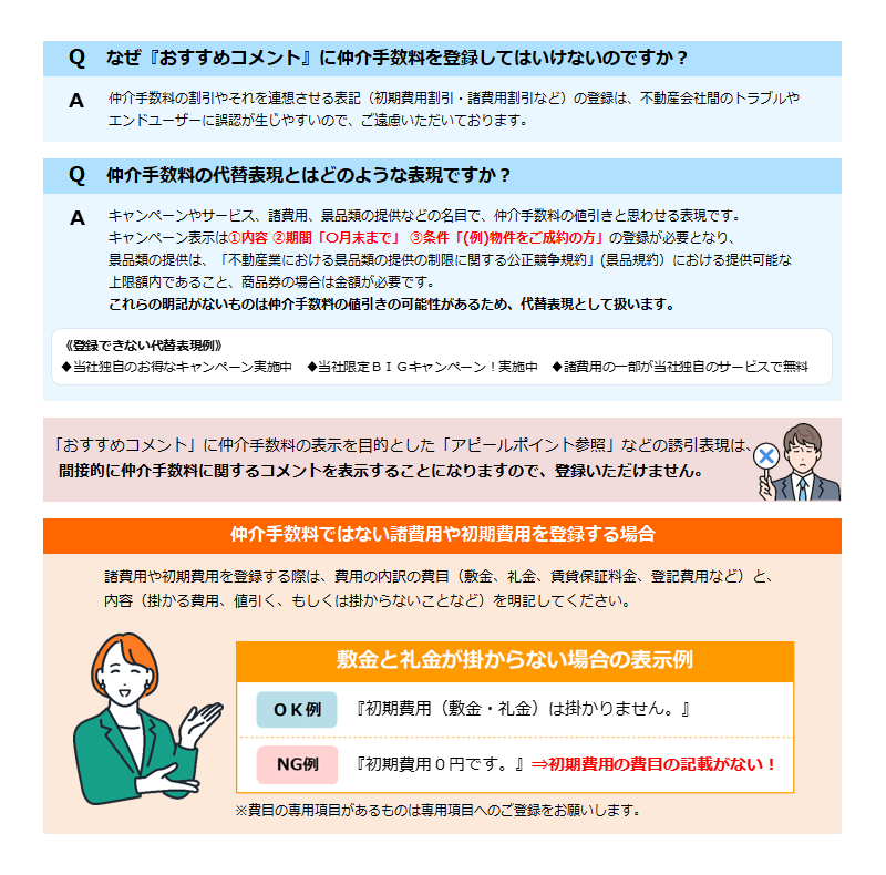 おすすめコメントや備考などのコメント欄に、仲介手数料または代替表現をご登録いただくことはご遠慮いただいております。