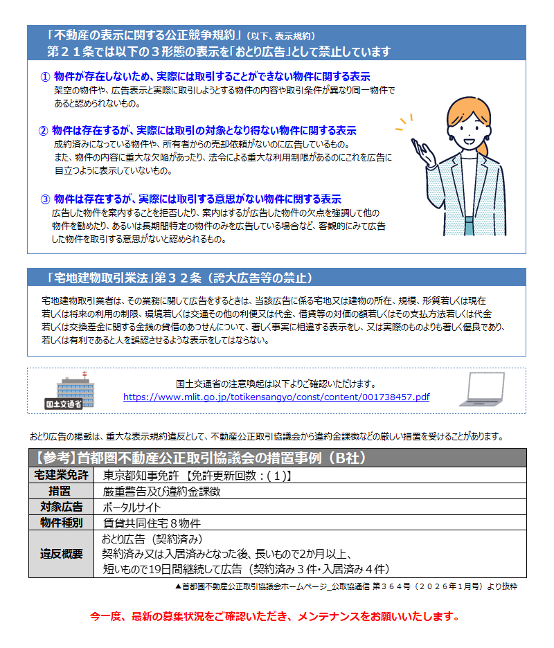 おとり広告は、不動産の表示に関する公正競争規約第21条および宅地建物取引業法第32条への違反行為となります。