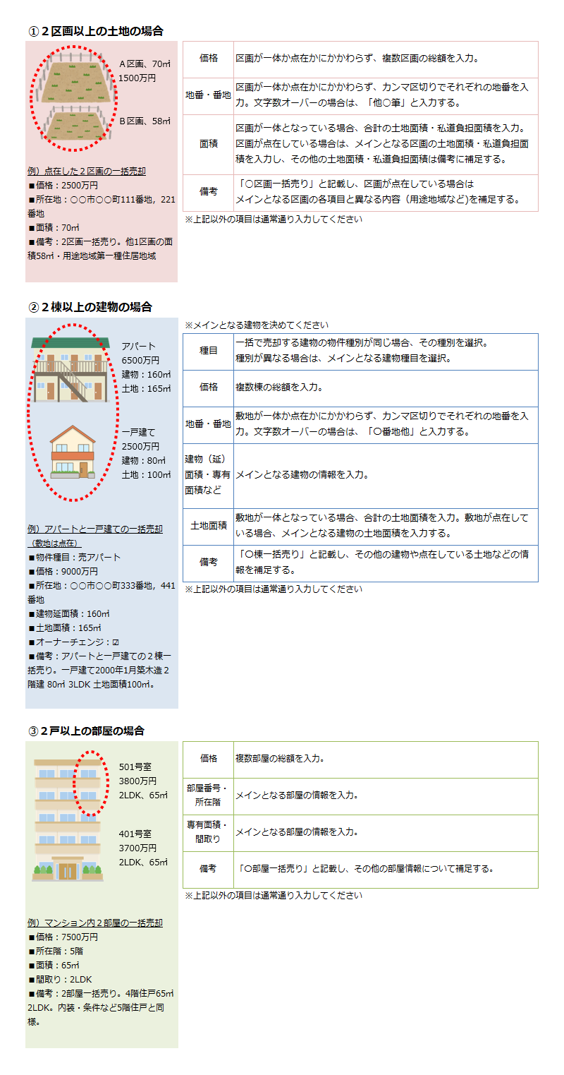 複数の土地や建物、部屋などを、まとめて販売する場合の登録ルールをご紹介いたします。